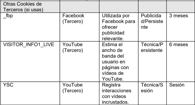 Facebook (Tercero – Meta Platforms, Inc.): _fbp (Utilizada por Facebook para la personalización y entrega de publicidad relevante. Publicidad/Persistente. Duración: 3 meses).