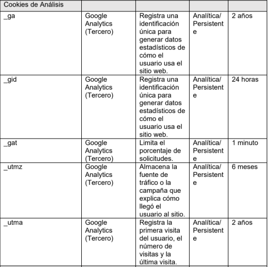 consultadas (_ga, _gid, _gat, _utmz, _utma). Estas cookies se clasifican como de análisis/medición y su instalación está supeditada al consentimiento explícito del usuario.