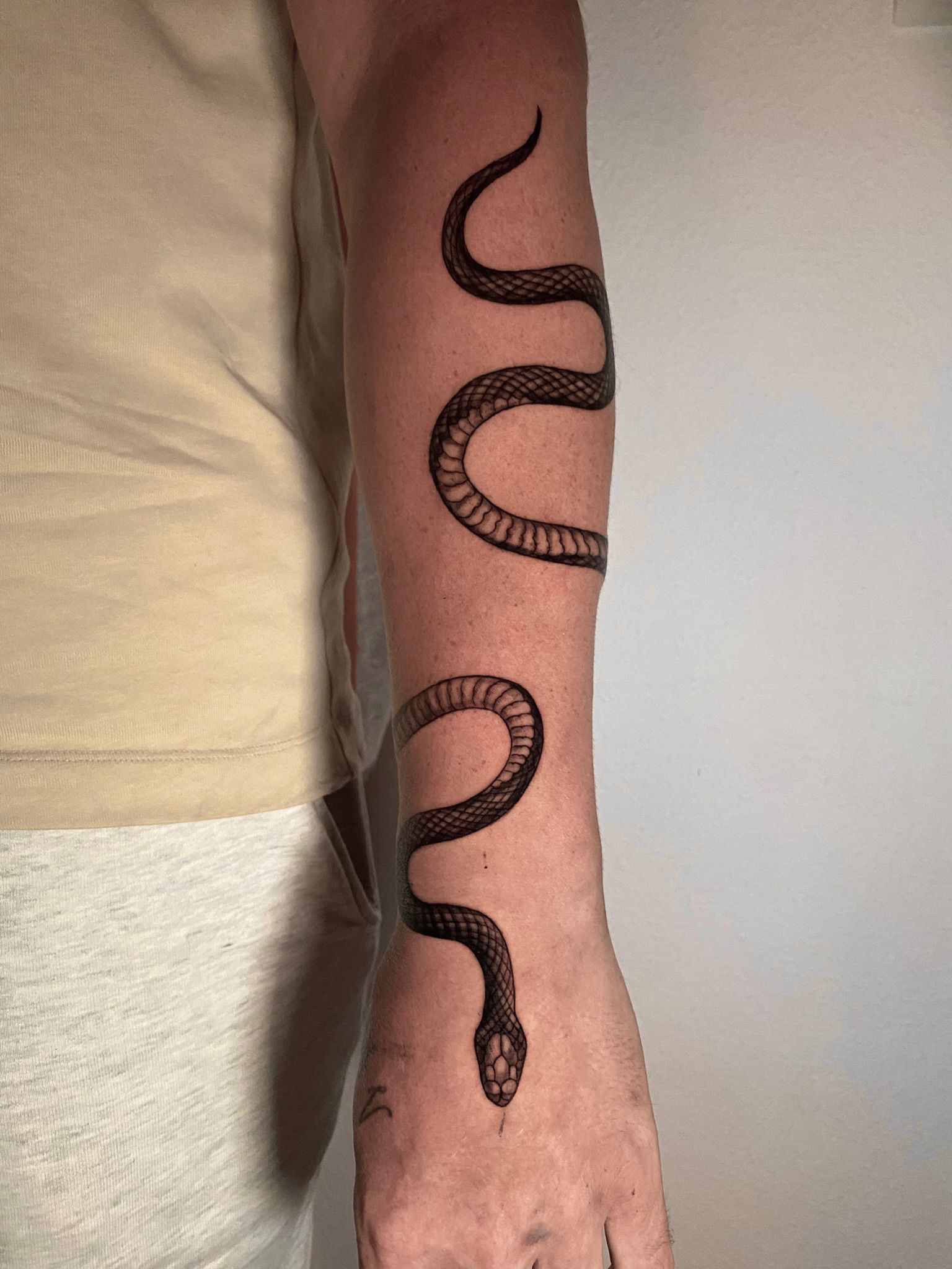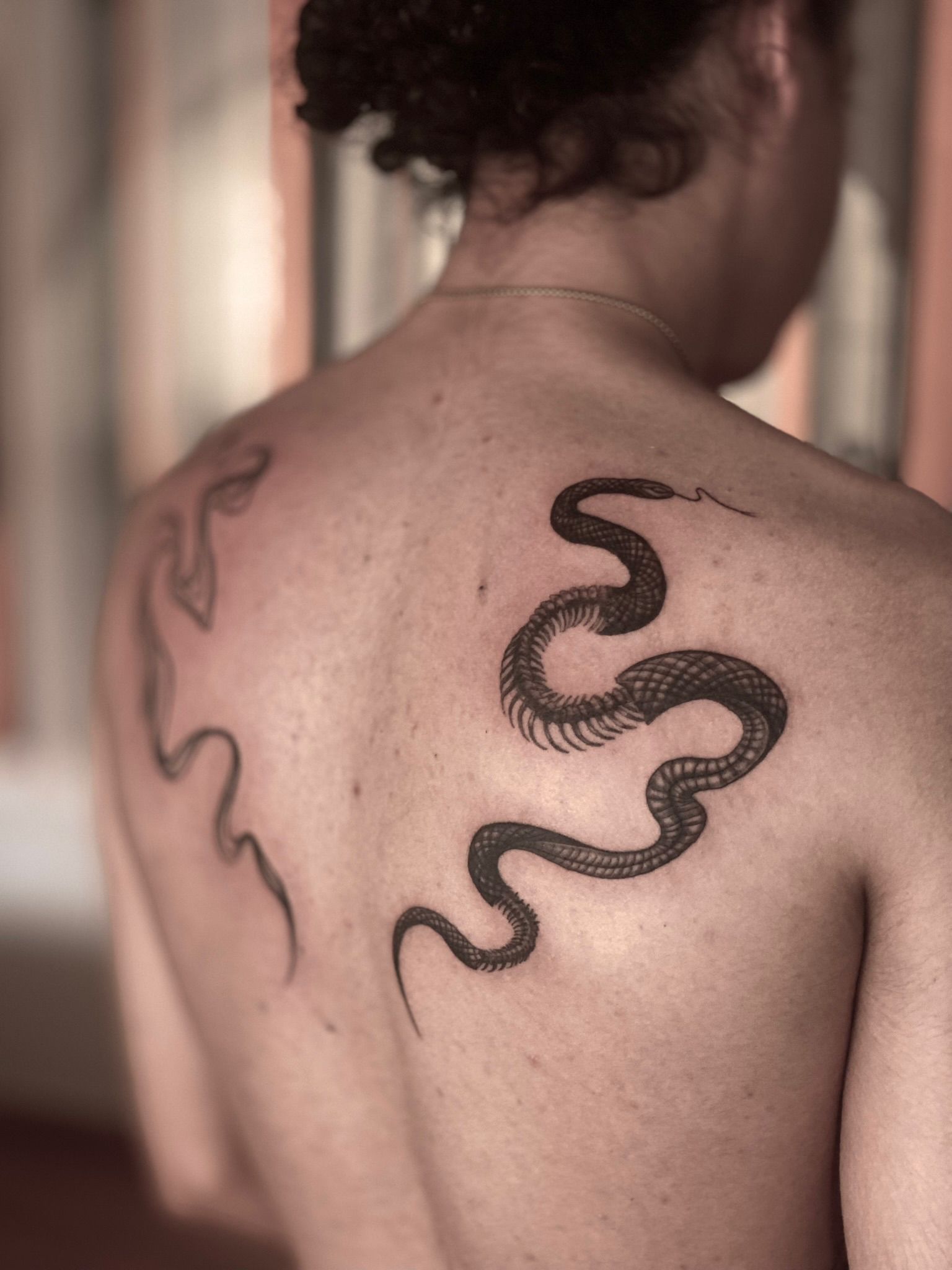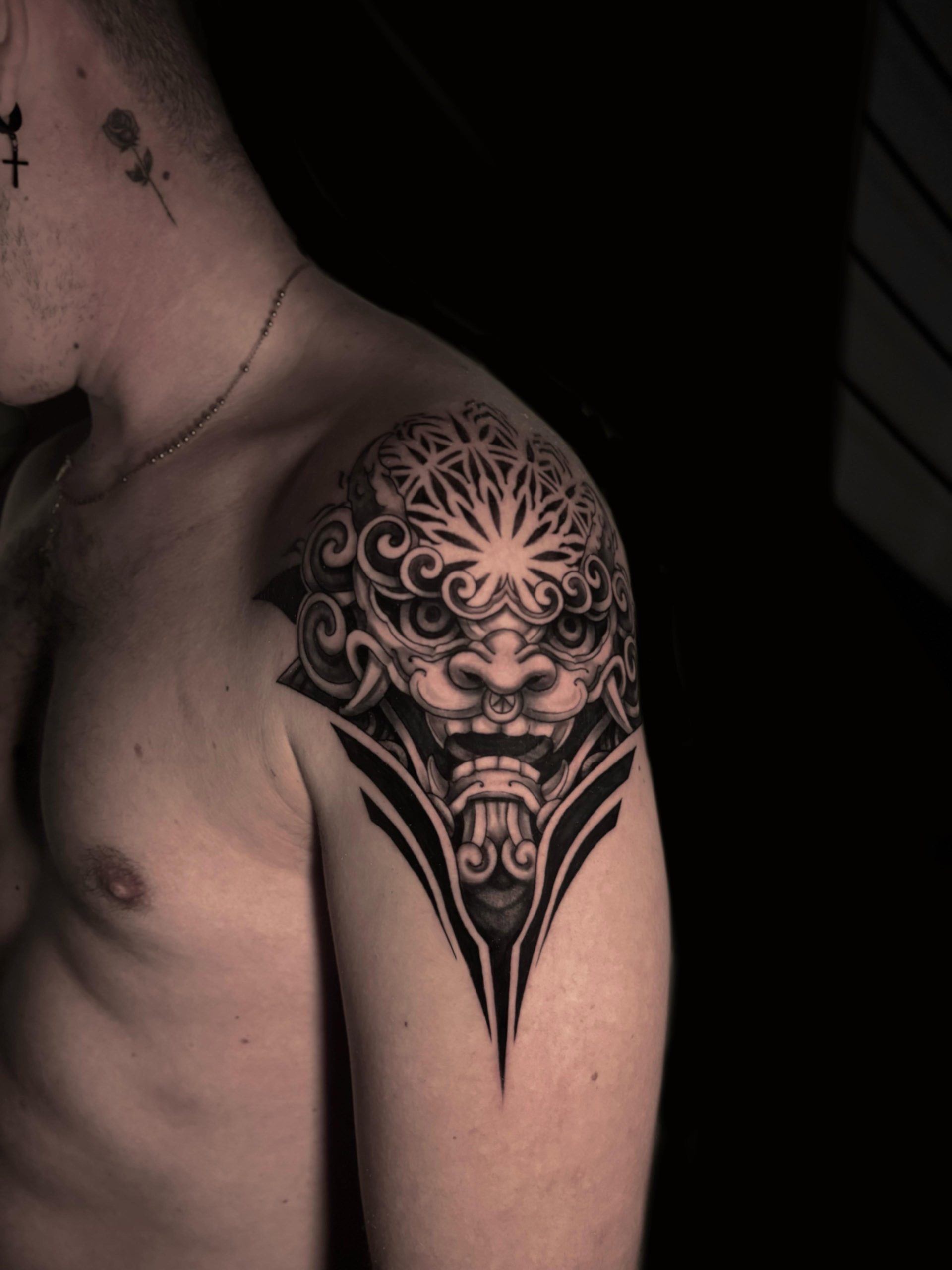 La elegancia del negro absoluto. El Blackwork es el estilo del contraste extremo. En Retiro Tattoo entendemos que el negro puro es el color que mejor envejece en la piel. Prescindimos de los tonos grises medios (sombras lavadas) para apostar por líneas sólidas, bloques de tinta negra densa y el uso inteligente del ‘espacio negativo’ (tu propia piel) como parte del diseño. Es un estilo potente, gráfico y moderno que garantiza una legibilidad perfecta a lo largo de los años, ideal para quienes buscan un tatuaje con carácter y definición.